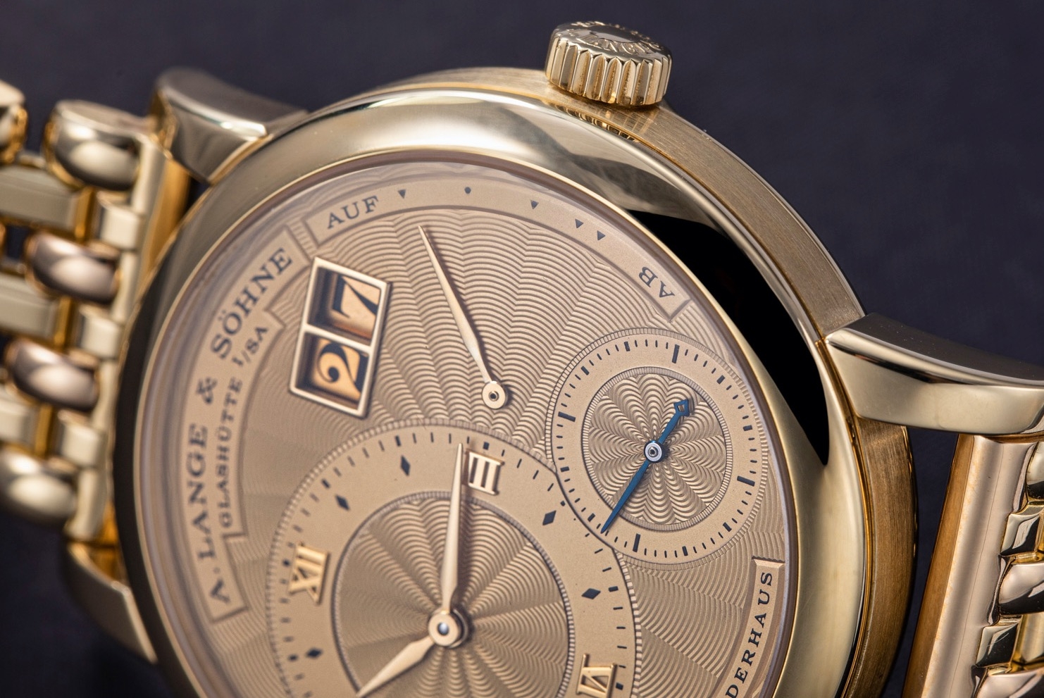 Đặc điểm nổi bật nhất của chiếc đồng hồ này là phần mặt số, được làm bằng vàng 18k nguyên khối chứ không phải bạc như quy chuẩn của Lange. Các nghệ nhân trang trí cho mặt số đồng hồ bằng những họa tiết guilloche đồng điệu.